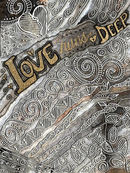 Until this popped up on my Facebook memories from this day last year, I forgot all about it. The art is compiled from a photo I took on a walk down a wooded road. It might have been a hornet’s nest that had fallen on the ground. I printed the photo and created a doodle on tracing paper, following the lines on the pic. Then I scanned the art and overplayed it in Photoshop. I converted most of the lines to white, added a drop shadow, and pasted in some glittering gold for the letters.
