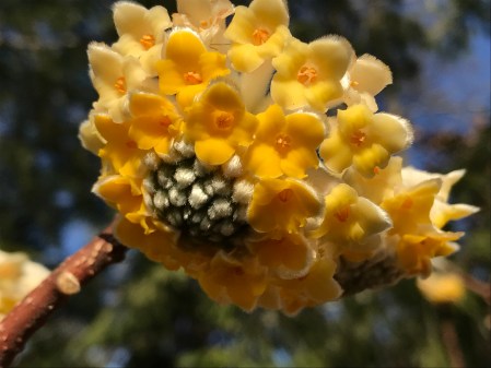 Even though I’ve lived in Georgia since 1981, I had never noticed a Paper Bush until this winter. What a beauty! Here is a photo of one of the golden yellow blooms taken on my walk today. I have to say the blooms look even better on a bright sunny, blue-sky kind of day like we’re having today.